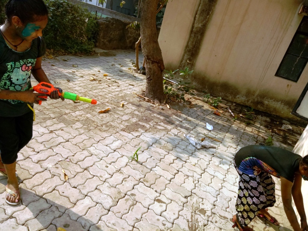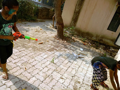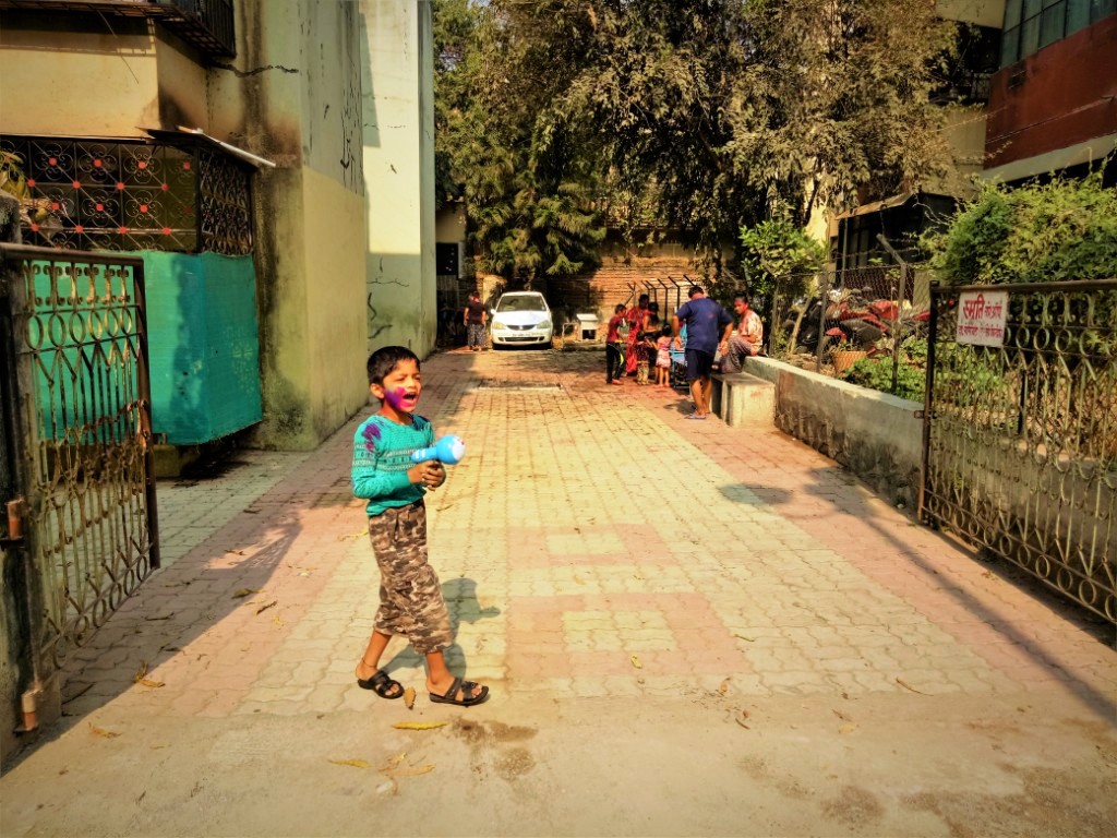 I woke up in the early morning and heard the babble of boys through an opened window of my room, saw them running with a bottle of watercolour. Crying aloud, whispering in ears, going secretly behind the back and throwing a bucket of water or with a sprinkler machine. I came out and glared at those happy faces. I remember it was at morning 9 am, my wife came out and saw me standing on the road and watching them with a camera in my hand. I was smiling at them to click a perfect picture.